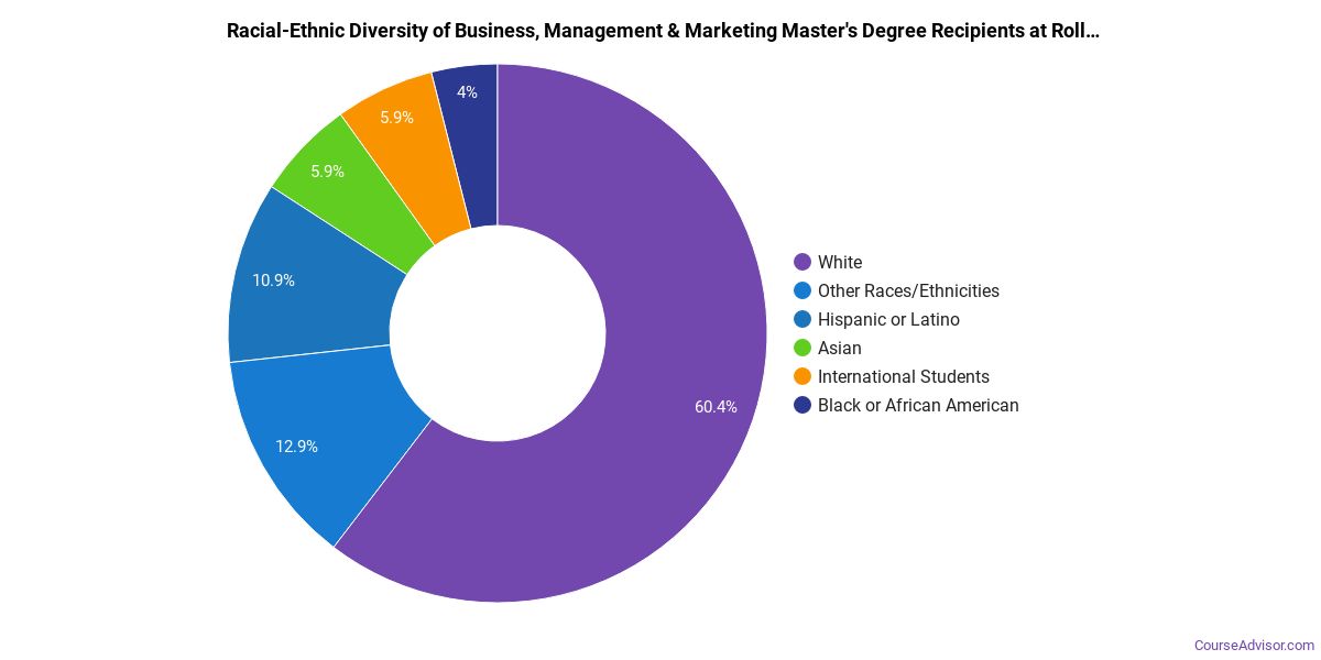 Of the students who received a business, management & marketing master's degree from Rollins, 57% were white. This is above average for this degree on the natiowide level.