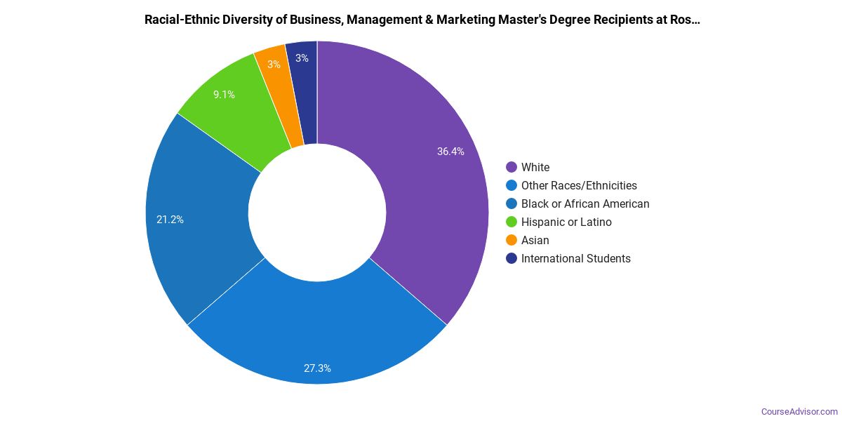 The following table and chart show the race/ethnicity for students who recently graduated from Rosemont College with a master's in business, management & marketing.