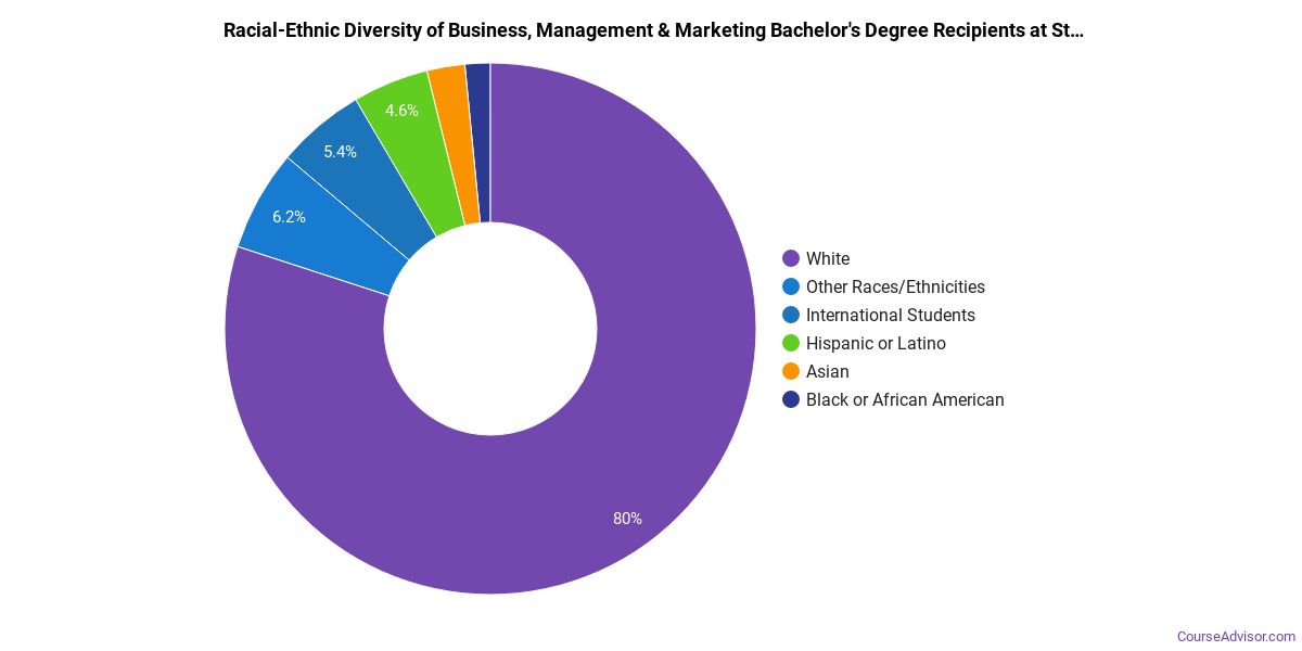 About 83% of those who receive a bachelor's degree in business, management & marketing at St. Bonaventure are white. This is above average for this degree on the nationwide level.