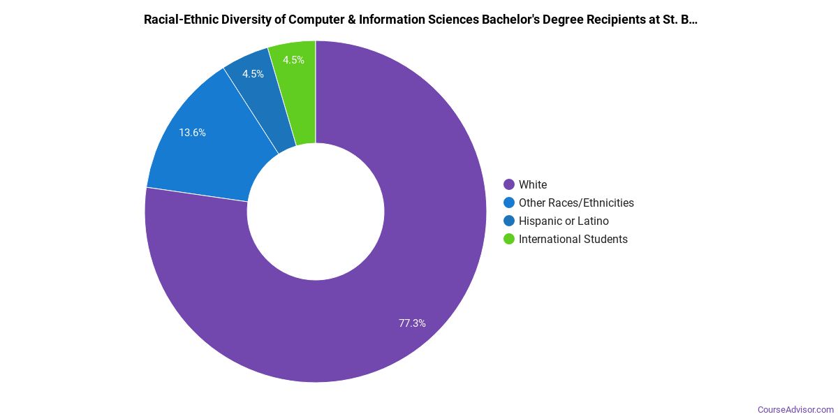 About 67% of those who receive a bachelor's degree in computer & information sciences at St. Bonaventure are white. This is above average for this degree on the nationwide level.