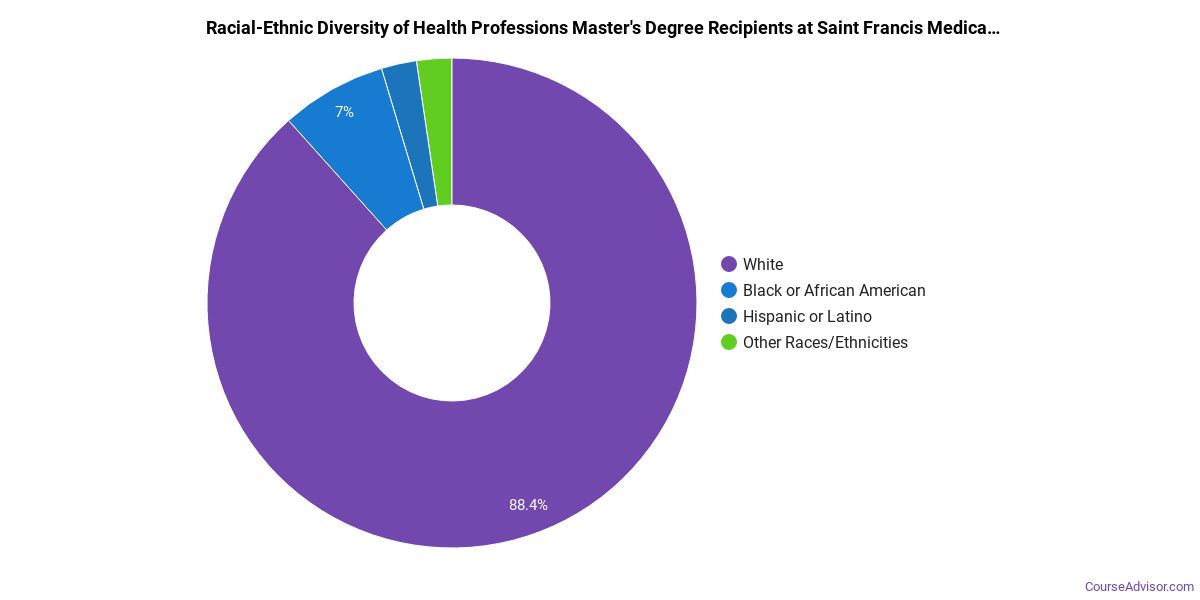 Of the students who received a health professions master's degree from St. Francis Medical Center College of Nursing, 83% were white. This is above average for this degree on the natiowide level.