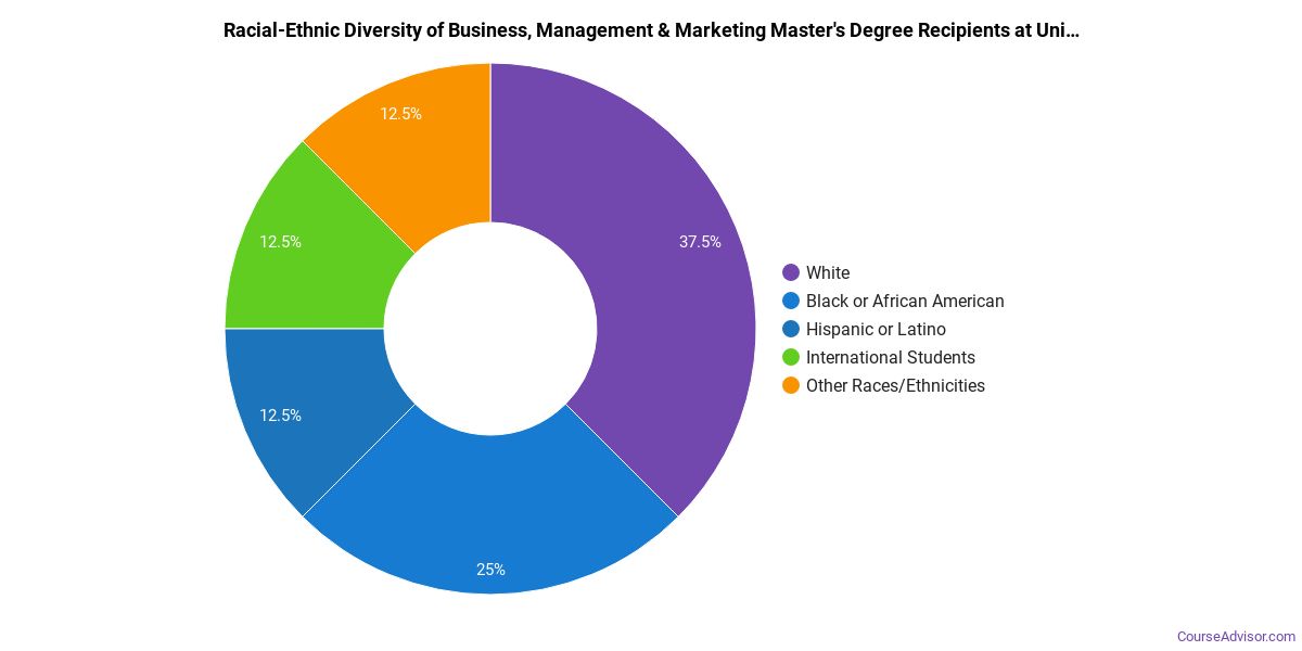 In the business, management & marketing master's program at this school, racial-ethnic minorities make up 50% of degree recipients. That is 12% better than the national average.*