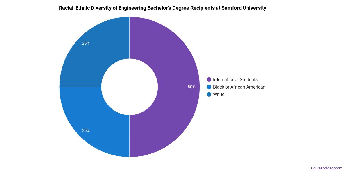 About 100% of those who receive a bachelor's degree in engineering at Samford are white. This is above average for this degree on the nationwide level.
