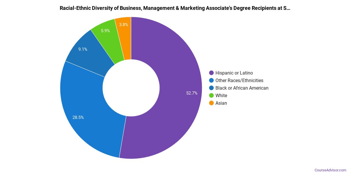 San Bernardino Valley College does a better job with serving racial-ethnic minorities than the typical school does. Its associate's program in business, management & marketing graduates 52% more racial-ethnic minorities than the nationwide average.*