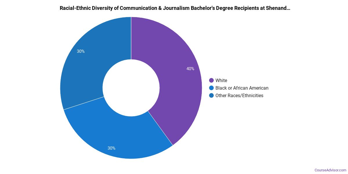 About 63% of those who receive a bachelor's degree in communication & journalism at Shenandoah are white. This is above average for this degree on the nationwide level.