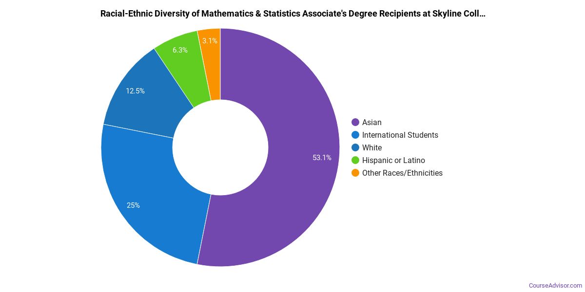 Skyline College does a better job with serving racial-ethnic minorities than the typical school does. Its associate's program in mathematics & statistics graduates 43% more racial-ethnic minorities than the nationwide average.*