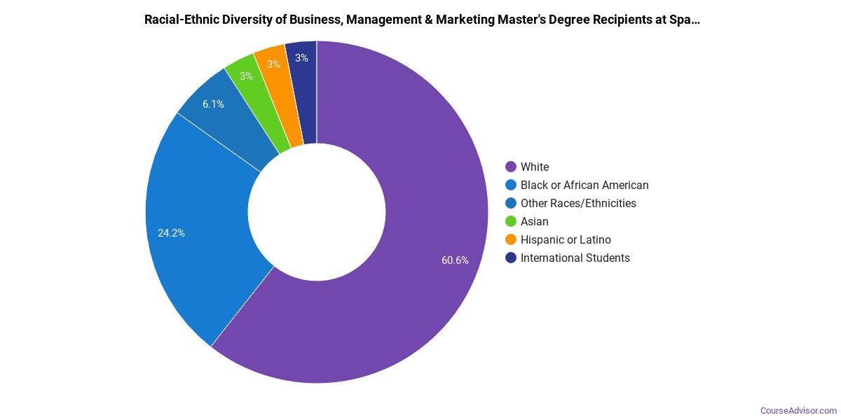 The following table and chart show the race/ethnicity for students who recently graduated from Spalding University with a master's in business, management & marketing.