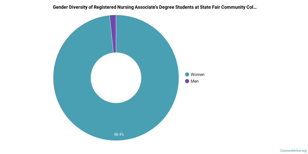 The majority of those who receive an associate's degree in registered nursing at State Fair Community College are white. Around 87% fell into this category, which is below average for this degree.