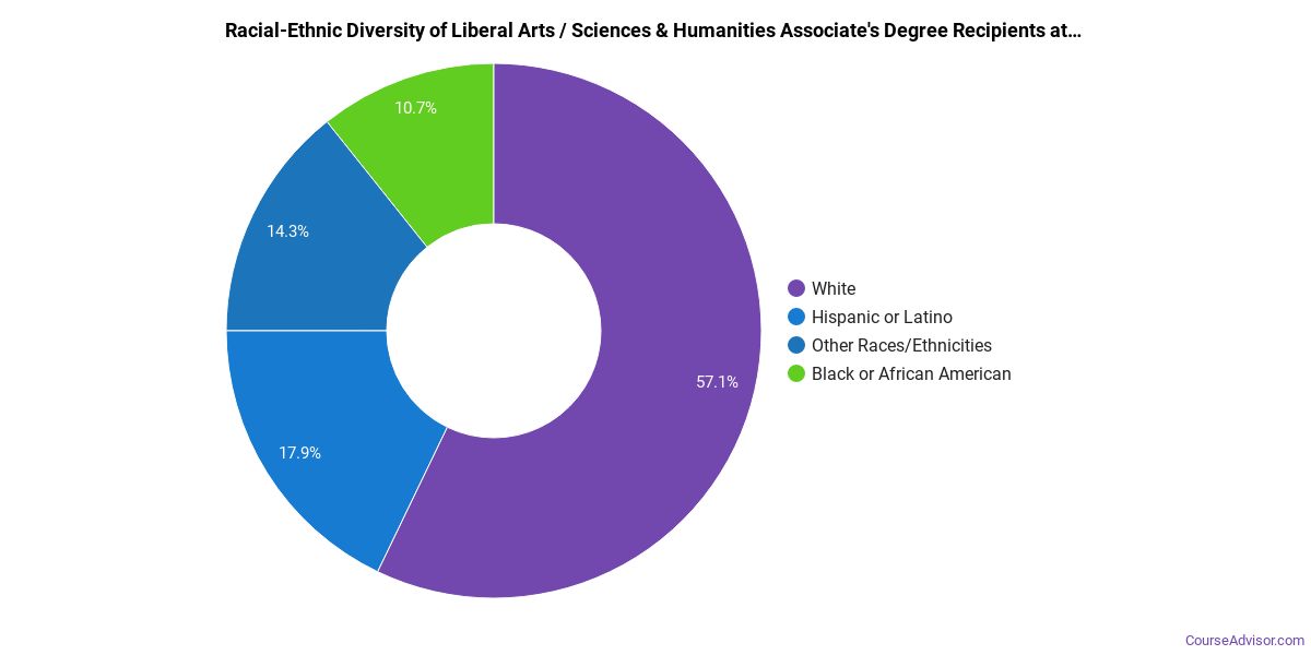 The majority of those who receive an associate's degree in liberal arts / sciences & humanities at TNCC are white. Around 54% fell into this category, which is below average for this degree.