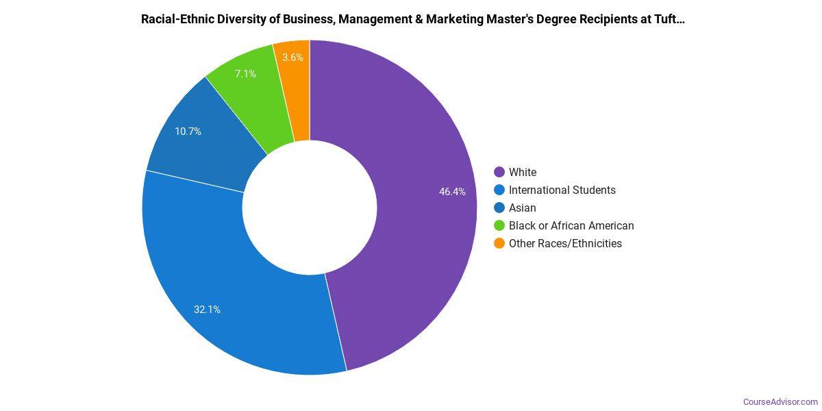 Of the students who received a business, management & marketing master's degree from Tufts, 54% were white. This is above average for this degree on the natiowide level.