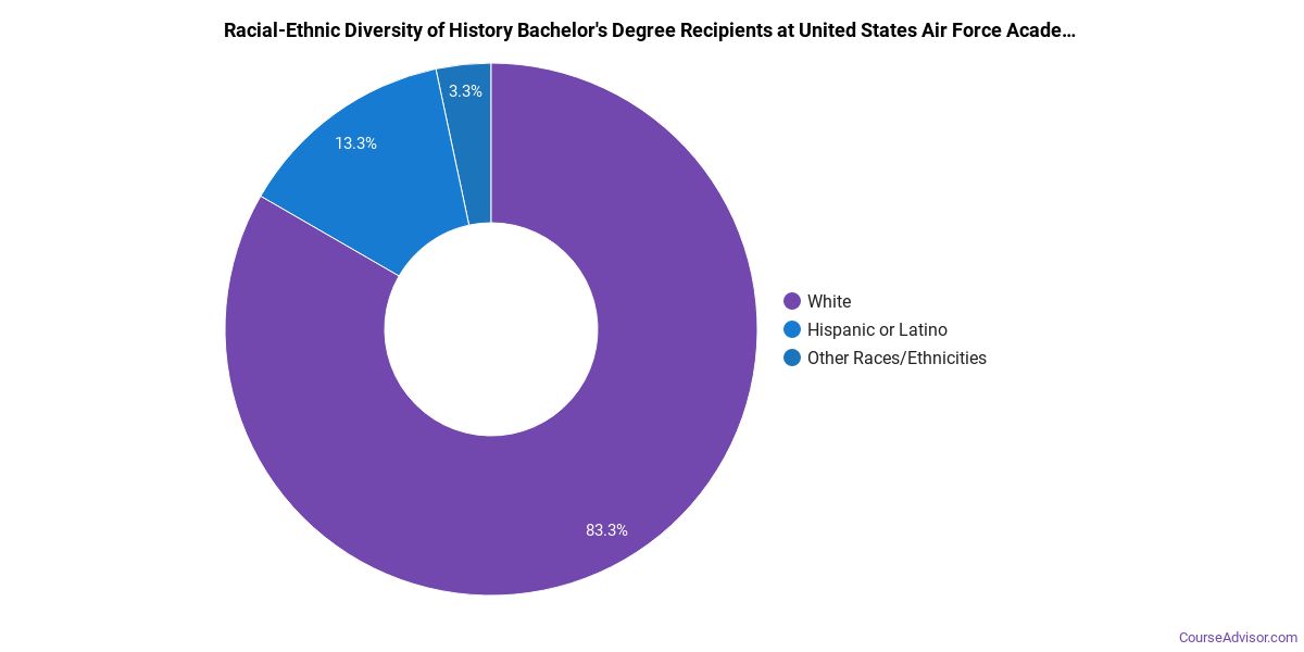 About 81% of those who receive a bachelor's degree in history at USAFA are white. This is above average for this degree on the nationwide level.