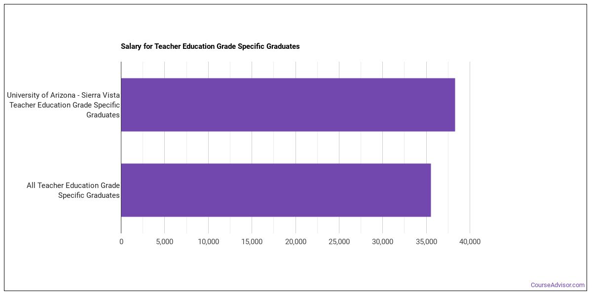 The median salary of grade specific ed students who receive their bachelor's degree at UA Sierra Vista is $38,323. This is great news for graduates of the program, since this figure is 8% higher than the national average of $35,527 for all grade specific ed bachelor's degree recipients.