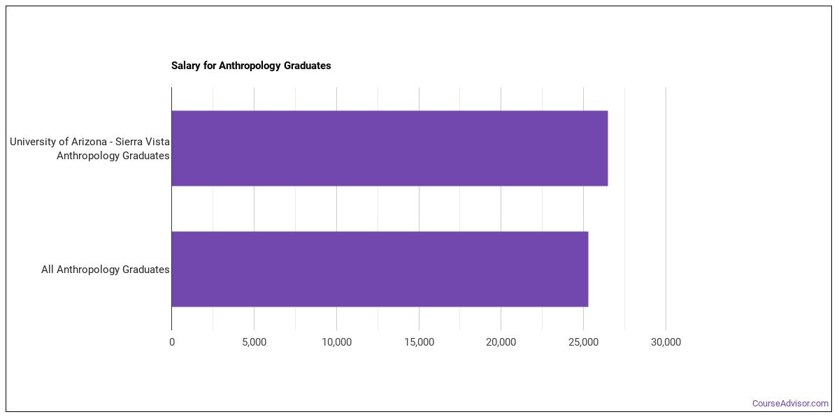 The median salary of anthropology students who receive their bachelor's degree at UA Sierra Vista is $26,481. This is great news for graduates of the program, since this figure is 5% higher than the national average of $25,284 for all anthropology bachelor's degree recipients.
