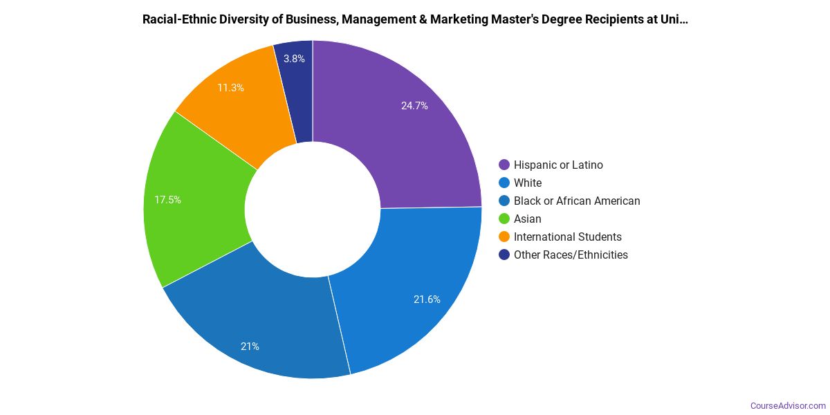 In the business, management & marketing master's program at this school, racial-ethnic minorities make up 72% of degree recipients. That is 34% better than the national average.*