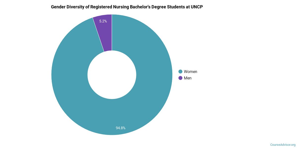 About 51% of those who receive a bachelor's degree in registered nursing at UNC Pembroke are white. This is typical for this degree on the nationwide level. Prospective students may be interested in knowing that this school graduates 5% more racial-ethnic minorities in its registered nursing bachelor's program than the national average.*