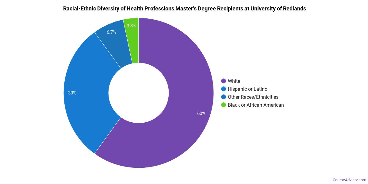 The following table and chart show the race/ethnicity for students who recently graduated from University of Redlands with a master's in health professions.