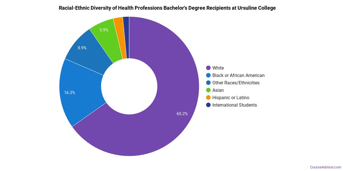 About 59% of those who receive a bachelor's degree in health professions at Ursuline College are white. This is above average for this degree on the nationwide level.
