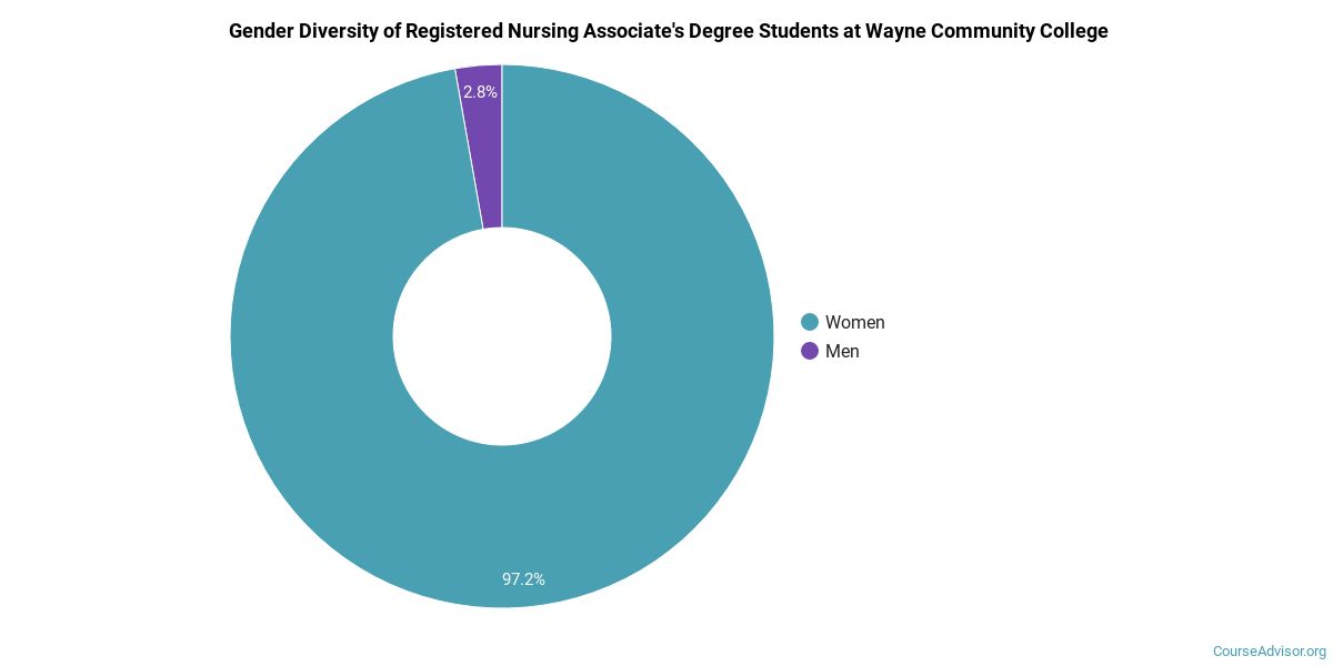 The majority of those who receive an associate's degree in registered nursing at Wayne Community College are white. Around 63% fell into this category, which is below average for this degree.