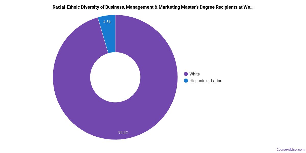 Of the students who received a business, management & marketing master's degree from Western, 83% were white. This is above average for this degree on the natiowide level.