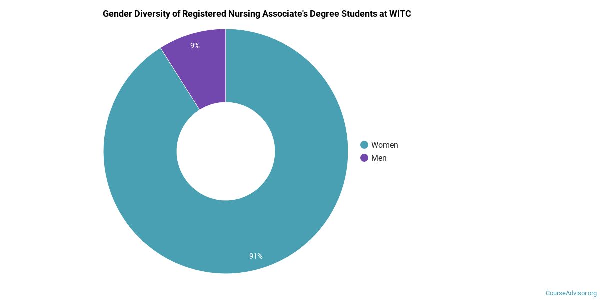 The majority of those who receive an associate's degree in registered nursing at WITC are white. Around 88% fell into this category, which is below average for this degree.