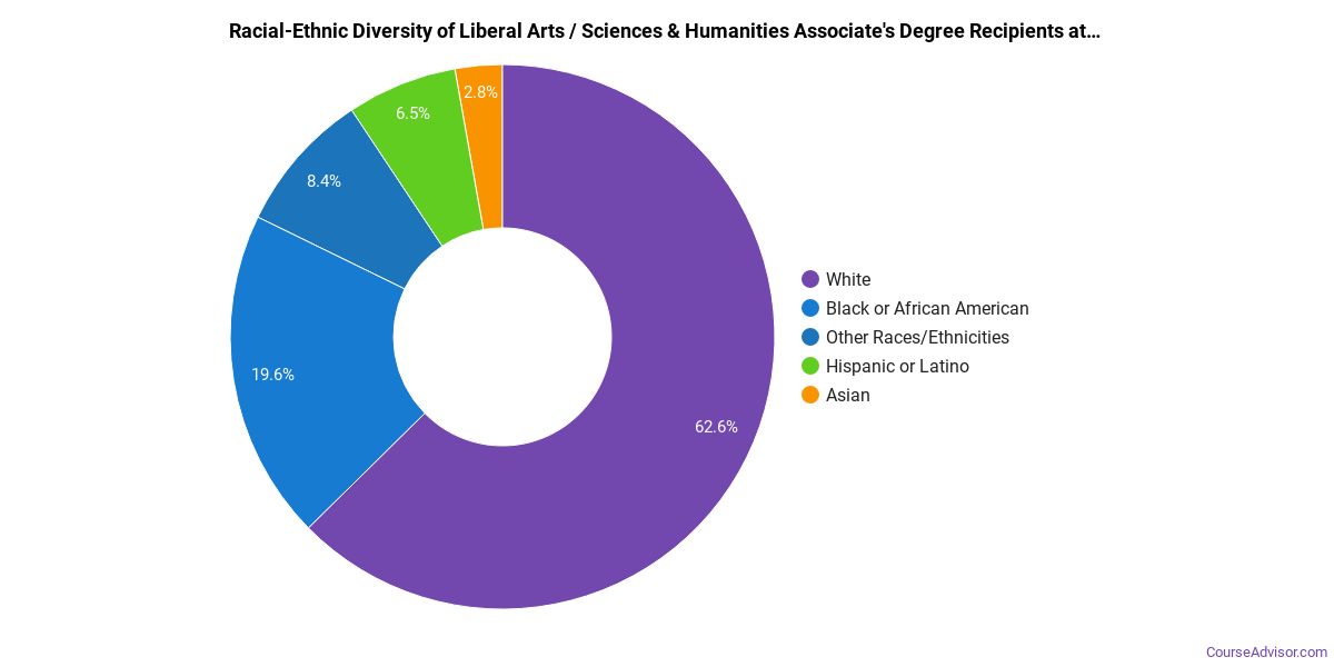 The majority of those who receive an associate's degree in liberal arts / sciences & humanities at Wor-Wic Community College are white. Around 72% fell into this category, which is below average for this degree.